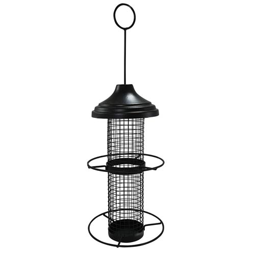 Feed dispenser for wild birds made of powder-coated metal with landing rings. Easy to fill due to removable roof.